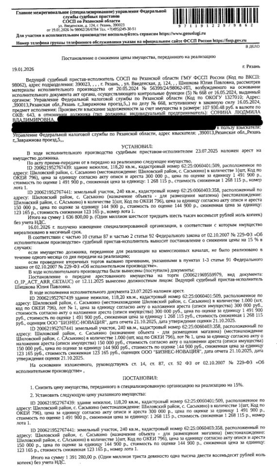 • Здание, назначение: нежилое наименование: нежилое, площадь 118,2 кв.м., кадастровый номер 62:25:0060401:509, местоположение: Рязанская область, р-н Шиловский, с Сасыкино. • Земельный участок, категория земель: земли населенных пунктов, виды разрешенного использования: для размещения магазина, площадь 240 +/- 10.84 кв.м., кадастровый номер 62:25:0060403:358, местоположение установлено относительно ориентира, расположенного в границах участка. Ориентир здание магазина. Почтовый адрес ориентира: обл. Рязанская, р-н Шиловский, с. Сасыкино. Взыскатель: УФНС по Рязанской области. Начальная цена 1 391 280 (Один миллион триста девяносто одна тысяча двести восемьдесят) руб. 00 коп., без НДС, сумма задатка 650 000 (Шестьсот пятьдесят тысяч) руб. 00 коп. Шаг аукциона 1%: 13 912 (Тринадцать тысяч девятьсот двенадцать) руб. 80 коп.