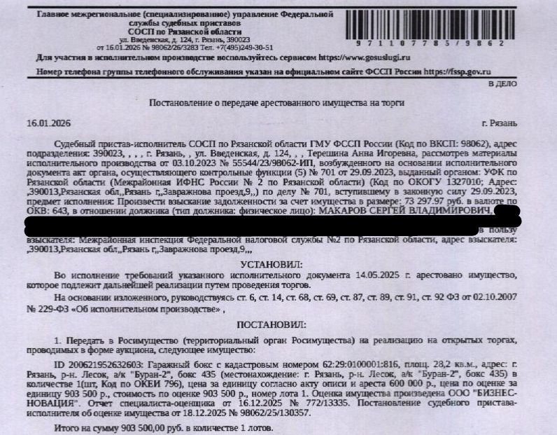 Здание, назначение: нежилое, наименование: гаражный бокс, кадастровый номер 62:29:0100001:816, площадь 28,2 кв.м, местоположение: г. Рязань, р-н Лесок, 2, а/к "Буран-2", бокс 435. Здание расположено в пределах объекта недвижимости с кадастровым номером 62:29:0100001:43, сведениями о правообладателе Организатор торгов не располагает. Взыскатель: МИФНС 2 по Рязанской области. Начальная цена: 903 500 (Девятьсот три тысячи пятьсот) руб. 00 коп., без НДС. Задаток: 440 000 (Четыреста сорок тысяч) руб. 00 коп. Шаг аукциона 1%: 9 035 (Девять тысяч тридцать пять) руб. 00 коп.