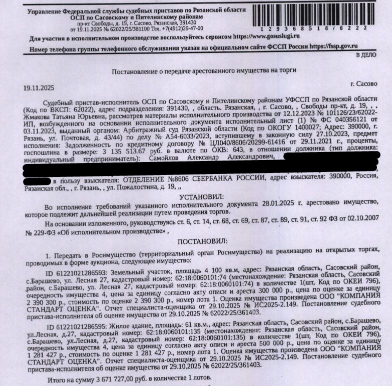 Здание, назначение: жилое, наименование: здание, площадь 61 кв.м., кадастровый номер 62:18:0060101:135, местоположение: Рязанская обл, р-н Сасовский, с Барашево, ул Лесная, д 27. Сведениями о зарегистрированных по данному адресу лицах Организатор торгов не располагает. Земельный участок, категория земель: земли населенных пунктов, виды разрешенного использования: для ведения подсобного хозяйства, площадь 4100 +/- 22.41 кв.м., кадастровый номер 62:18:0060101:74, адрес: Рязанская обл, Сасовский м.р-н, с/п Демушкинское, село Барашево, ул. Лесная, з/у 27. Доп.информация - см.извещение. Взыскатель: ПАО Сбербанк России. Начальная цена: 3 671 727 (Три миллиона шестьсот семьдесят одна тысяча семьсот двадцать семь) руб. 00 коп., без НДС. Задаток: 1 800 000 (Один миллион восемьсот тысяч) руб. 00 коп. Шаг аукциона 1%: 36 717 (Тридцать шесть тысяч семьсот семнадцать) руб. 27 коп.