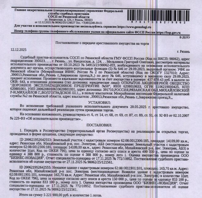 Здание, назначение: нежилое, наименование: здание конторы, площадь 163,7 кв.м, к.н. 62:08:0011901:101, местоположение: Рязанская обл., г. Михайлов, пос. Электрик. Земельный участок, категория земель: земли промышленности, энергетики, транспорта, связи, радиовещания, телевидения, информатики, земли для обеспечения космической дея-ти, земли обороны, безопасности и земли иного спец. назначения, ВРИ: под объекты автомобильного транспорта, пл. 14109 +/- 3.1 кв.м, к.н. 62:08:0012306:185. Взыскатель, в пользу которого обращено взыскание - МИФНС 2 по Ряз.обл. Согласно выписке ЕГРН имеются сведения о залоге им-ва в пользу МИФНС 5 по Ряз.обл. Реализация имущества должника не лишает права залогодержателя на обращение взыскания на предмет залога. Начальная цена: 5 221 900 (Пять миллионов двести двадцать одна тысяча девятьсот) руб. 00 коп., без НДС. Задаток: 250 000 (Двести пятьдесят тысяч) руб. 00 коп.Шаг аукциона 1%: 52 219 (Пятьдесят две тысячи двести девятнадцать) руб. 00 коп.
