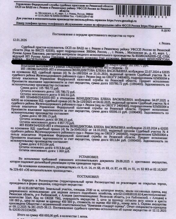Земельный участок, категория земель: земли населенных пунктов, виды разрешенного использования: для ведения личного подсобного хозяйства, кадастровый номер 62:13:0020101:614, площадь 2500 +/- 18 кв.м, местоположение: Рязанская область, р-н Рыбновский, с Алешня. Вид ограничений (обременений): ограничения прав на земельный участок, предусмотренные ст. 56 ЗК РФ. Взыскатель: УФНС по Рязанской области. Начальная цена: 450 000 (Четыреста пятьдесят тысяч) руб. 00 коп., без НДС. Задаток: 220 000 (Двести двадцать тысяч) руб. 00 коп. Шаг аукциона 1%: 4 500 (Четыре тысячи пятьсот) руб. 00 коп.
