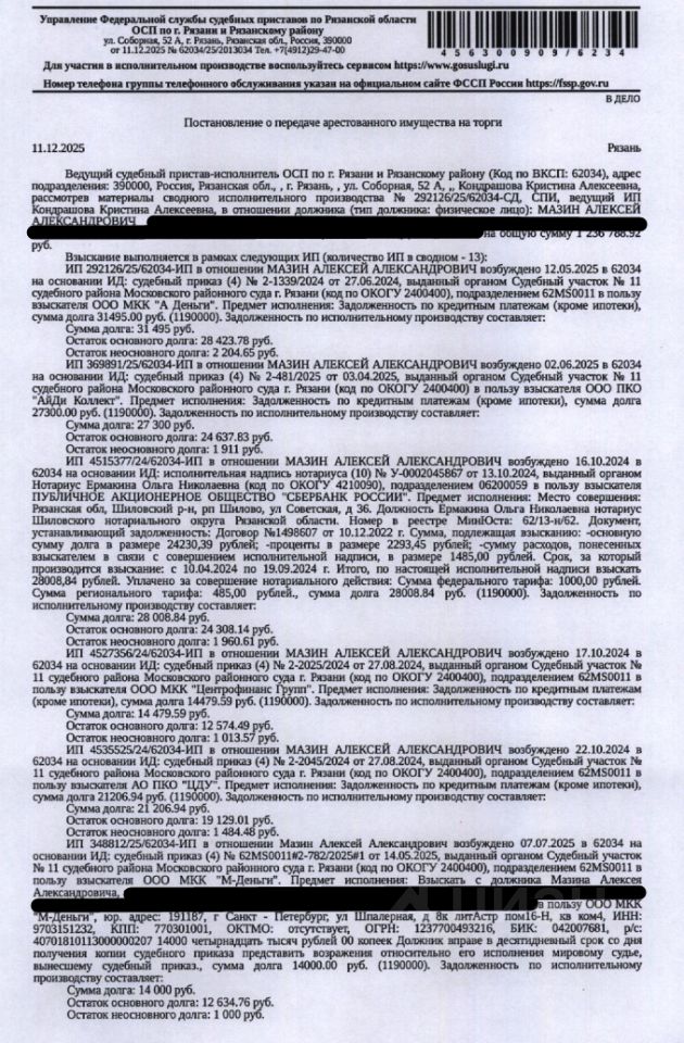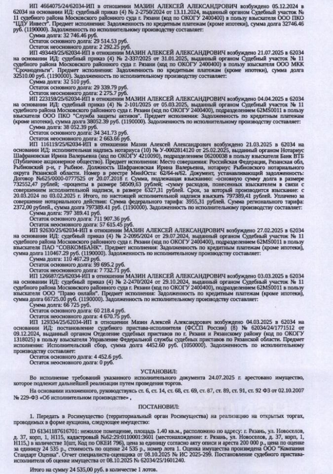 Помещение, назначение: нежилое, наименование: нежилое помещение, площадь 1,4 кв.м, кадастровый номер 62:29:0110001:3601, местоположение: г. Рязань, ул. Новоселов, д. 37 к.1, Н115. Взыскатель: ООО МКК "А Деньги", ООО ПКО "АйДи Коллект" и др. Начальная цена: 24 535 (Двадцать четыре тысячи пятьсот тридцать пять) руб. 00 коп., без НДС. Задаток: 10 000 (Десять тысяч) руб. 00 коп. Шаг аукциона 1%: 245 (Двести сорок пять) руб. 35 коп.