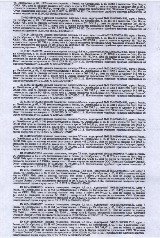 Помещение, назначение: нежилое, подвал 0, площадь 5 кв.м., кадастровый номер 62:29:0030034:549, местоположение: Рязанская обл, г Рязань, ул Октябрьская, д 65, пом H202. Взыскатель: Емельянов А.И. Начальная цена: 264 230 (Двести шестьдесят четыре тысячи двести тридцать) руб. 00 коп., без НДС. Задаток: 130 000 (Сто тридцать тысяч) руб. 00 коп. Шаг аукциона 1%: 2 642 (Две тысячи шестьсот сорок два) руб. 30 коп.