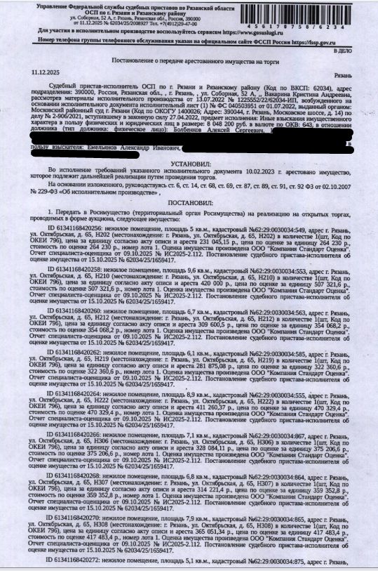 Помещение, назначение: нежилое, наименование: помещение, подвал 0, площадь 6,1 кв.м., кадастровый номер 62:29:0030034:1498, местоположение: Рязанская обл, г. Рязань, ул. Октябрьская, д. 65, Н477. Взыскатель: Емельянов А.И. Начальная цена: 322 360 (Триста двадцать две тысячи триста шестьдесят) руб. 60 коп., без НДС. Задаток: 160 000 (Сто шестьдесят тысяч) руб. 00 коп. Шаг аукциона 1%: 3 223 (Три тысячи двести двадцать три) руб. 61 коп.