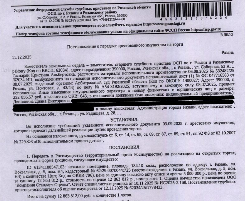 Помещение, назначение: нежилое, наименование: нежилое помещение, площадь 184,1 кв.м., кадастровый номер 62:29:0070044:725, адрес: Российская Федерация, Рязанская область, г.о. город Рязань, г Рязань, ул Вокзальная, д. 5, помещ. Н4. Взыскатель, в пользу которого обращено взыскание - Администрация города Рязани. Согласно выписке ЕГРН от 05.02.2026 имеются сведения о залоге имущества в пользу Муниципального образования городской округ город Рязань. Реализация имущества должника не лишает права залогодержателя на обращение взыскания на предмет залога. Начальная цена: 12 863 812 (Двенадцать миллионов восемьсот шестьдесят три тысячи восемьсот двенадцать) руб. 00 коп., без НДС. Задаток: 640 000 (Шестьсот сорок тысяч) руб. 00 коп. Шаг аукциона 1%: 128 638 (Сто двадцать восемь тысяч шестьсот тридцать восемь) руб. 12 коп.
