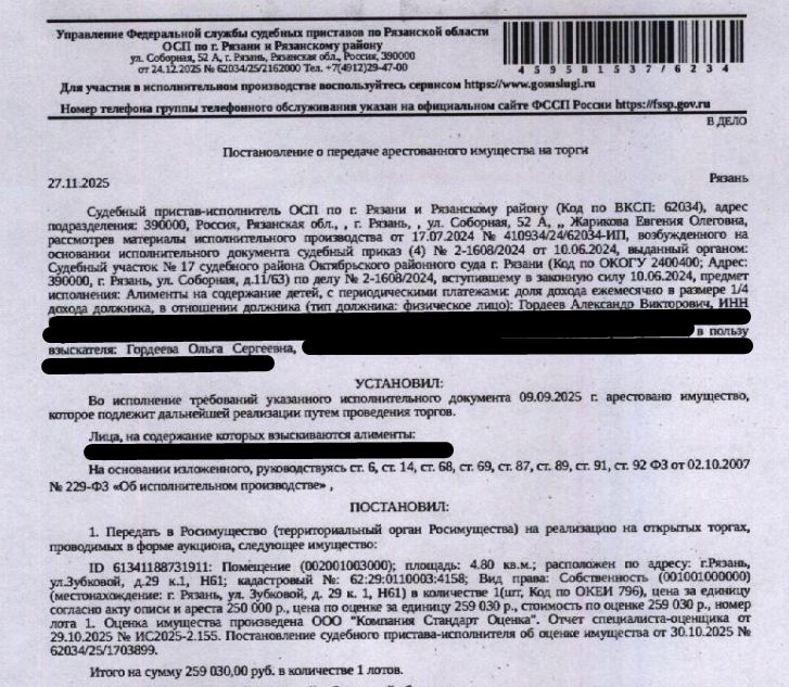 Помещение, назначение: нежилое, наименование: нежилое помещение, цокольный этаж, площадь 4,8 кв.м., кадастровый номер 62:29:0110003:4158, местоположение: г.Рязань, ул.Зубковой, д.29 к.1, Н61. Взыскатель: Гордеева О.С. Начальная цена: 259 030 (Двести пятьдесят девять тысяч тридцать) руб. 00 коп., без НДС. Задаток: 120 000 (Сто двадцать тысяч) руб. 00 коп. Шаг аукциона 1%: 2 590 (Две тысячи пятьсот девяносто) руб. 30 коп.