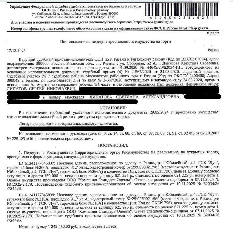 Здание, назначение: нежилое, наименование: гаражный бокс, площадь 31,7 кв.м., кадастровый номер 62:29:0060021:983, местоположение: Рязанская область, г. Рязань, р-н Юбилейный, 4, ГСК "Луч", гаражный бокс 266 А. Здание расположено в пределах земельного участка с кадастровым номером 62:29:0060021:4, сведениями о правообладателе Организатор торгов не располагает, согласно ответу Администрации г. Рязани от 04.02.2026 предоставлен ГСК "Луч" по договору аренды А 462-02 от 20.11.2002 для обслуживания гаражей. Взыскатель: Липатова С.А. Начальная цена: 621 225 (Шестьсот двадцать одна тысяча двести двадцать пять) руб. 00 коп., без НДС. Задаток: 300 000 (Триста тысяч) руб. 00 коп. Шаг аукциона 1%: 6 212 (Шесть тысяч двести двенадцать) руб. 25 коп.