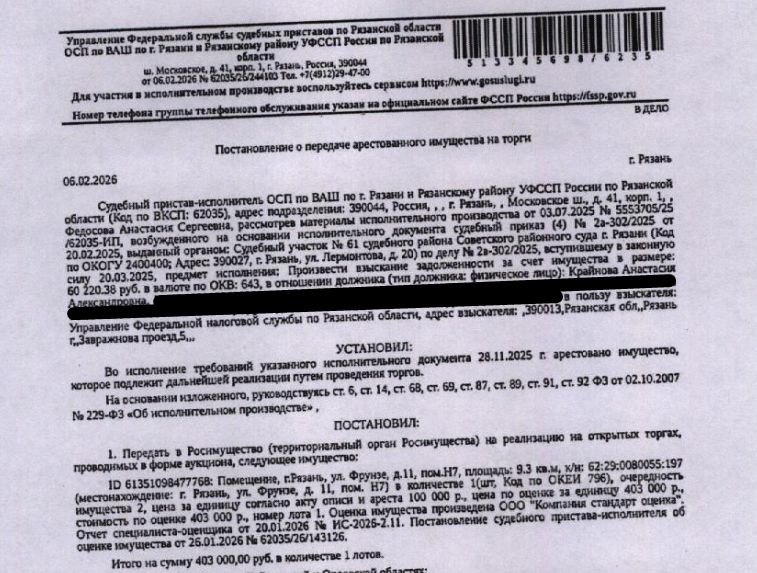 Помещение, назначение: нежилое, наименование: нежилое помещение, площадь 9,3 кв.м., кадастровый номер 62:29:0080055:197, местоположение: Рязанская область, г. Рязань, ул. Фрунзе, д. 11, пом. Н7. Взыскатель: УФНС по Рязанской области. Начальная цена: 403 000 (Четыреста три тысячи) руб. 00 коп., без НДС. Задаток: 200 000 (Двести тысяч) руб. 00 коп. Шаг аукциона 1%: 4 030 (Четыре тысячи тридцать) руб. 00 коп.