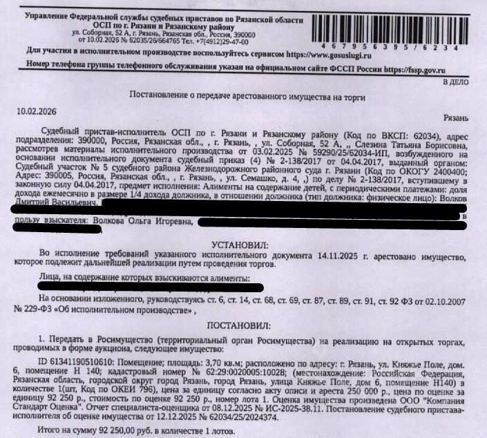 Помещение, назначение: нежилое, подвал подвал, площадь 3,7 кв.м., кадастровый номер 62:29:0020005:10028, адрес: Российская Федерация, Рязанская область, городской округ город Рязань, город Рязань, улица Княжье Поле, дом 6, помещение Н140. Взыскатель: Волкова О.И. Начальная цена: 92 250 (Девяносто две тысячи двести пятьдесят) руб. 00 коп., без НДС. Задаток: 40 000 (Сорок тысяч) руб. 00 коп. Шаг аукциона 1%: 922 (Девятьсот двадцать два) руб. 50 коп.