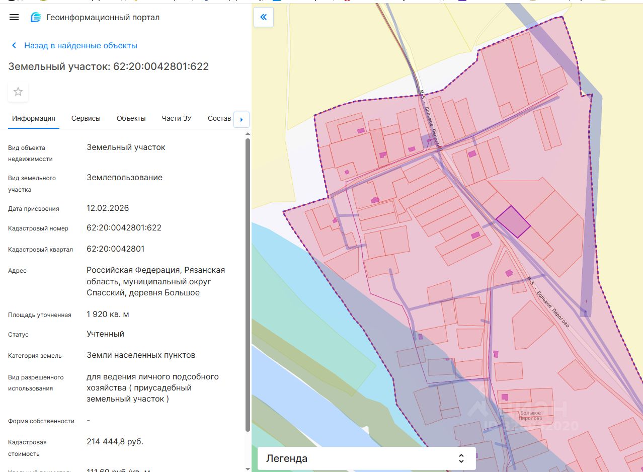земельный участок, расположен на землях населенных пунктов, площадью 1920 кв.м, с кадастровым номером 62:20:0042801:622, местоположение Рязанская область, Спасский муниципальный округ, д.Большое Пирогово, с разрешенным использованием для ведения личного подсобного хозяйства (приусадебный земельный участок)