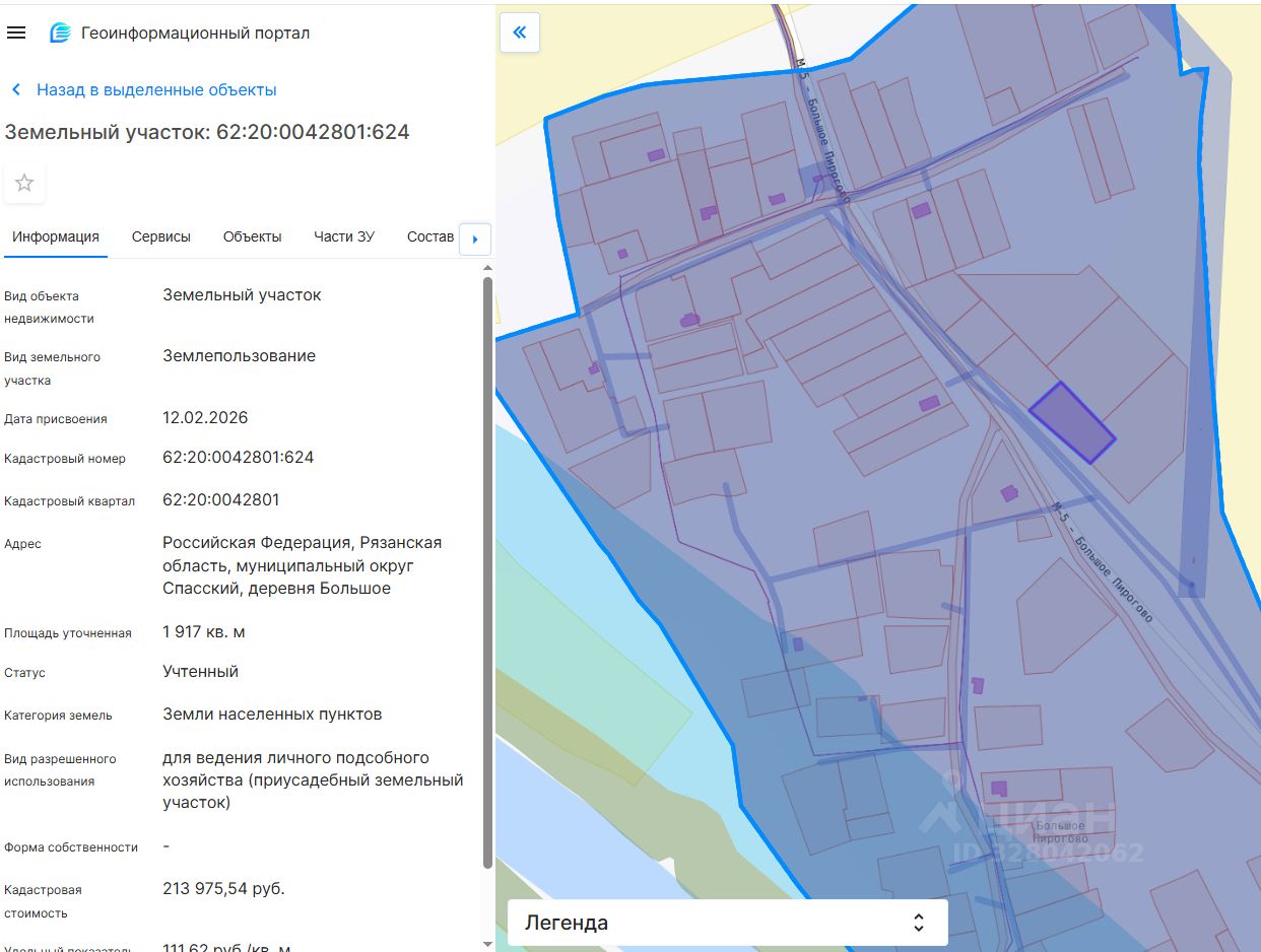 земельный участок, расположенный на землях населенных пунктов, площадью 1917 кв.м, с кадастровым номером 62:20:0042801:624, местоположение Рязанская область, Спасский муниципальный округ, д.Большое Пирогово, с разрешенным использованием для ведения личного подсобного хозяйства (приусадебный земельный участок)