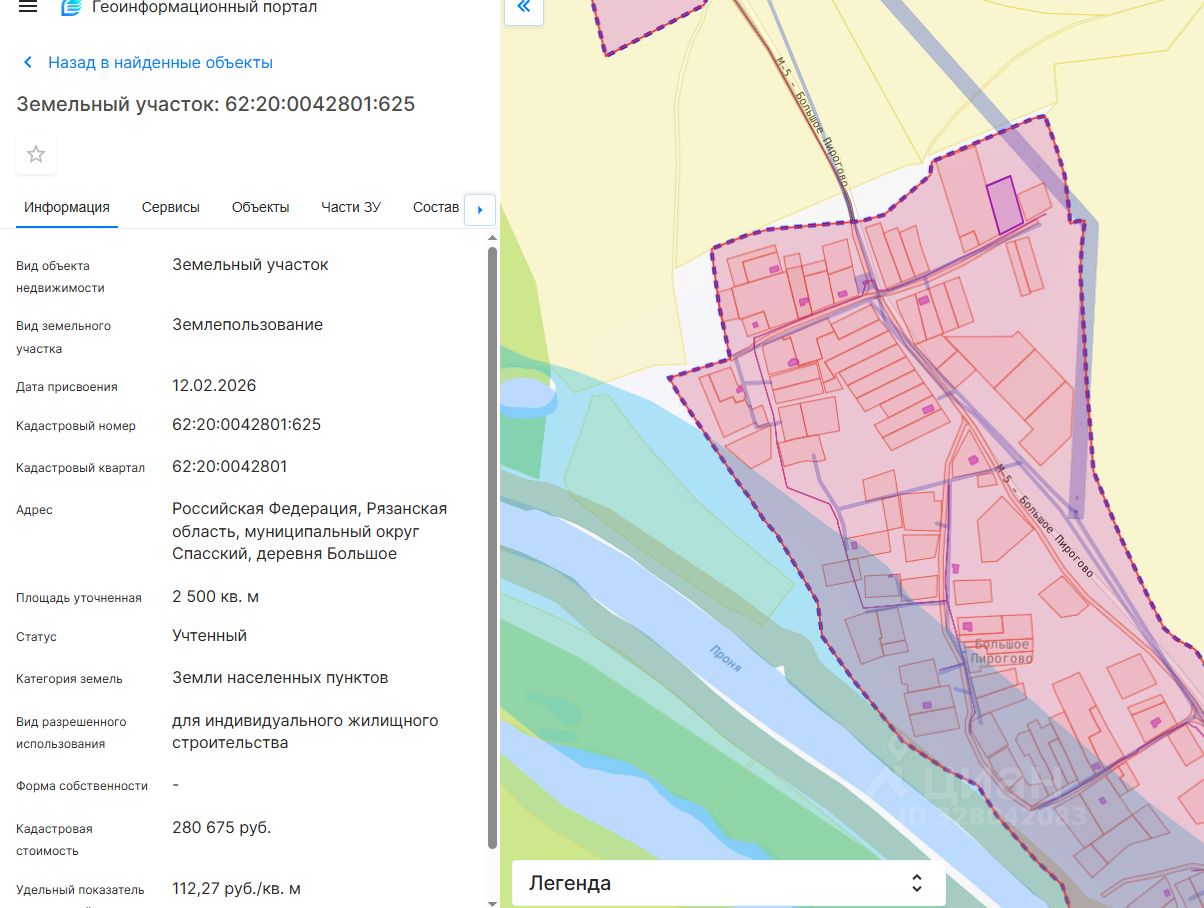 Земельный участок, расположен на землях населенных пунктов, площадью 2500 кв.м, с кадастровым номером 62:20:0042801:625, местоположение Рязанская область, Спасский муниципальный округ, д.Большое Пирогово, с разрешенным использованием для индивидуального жилищного строительства