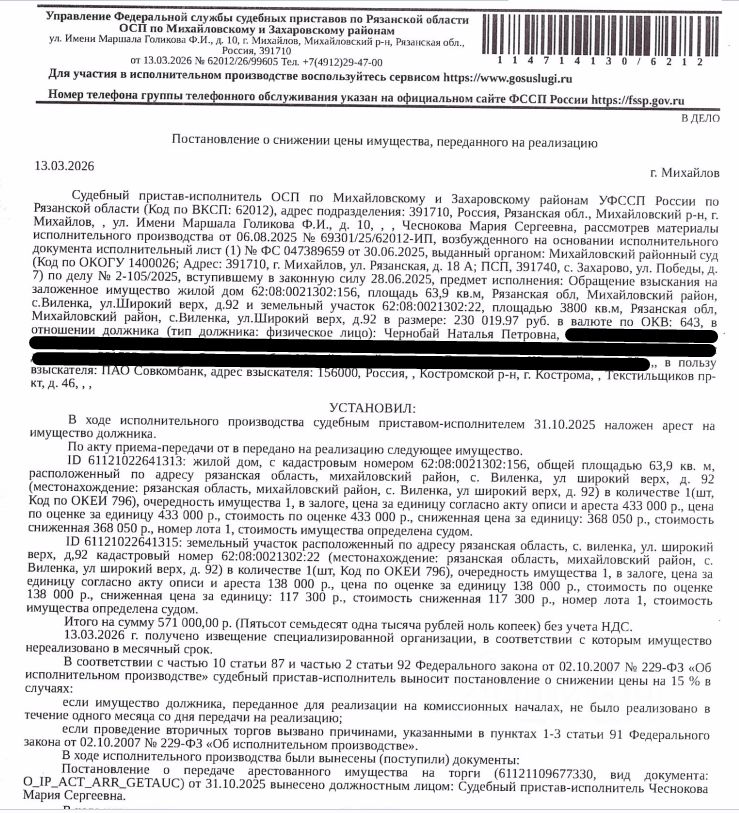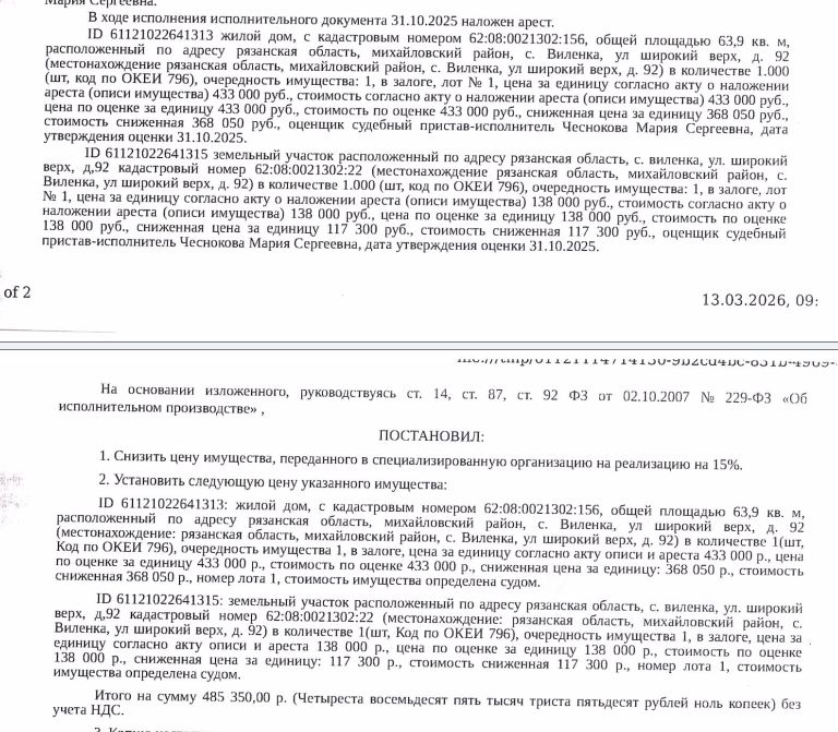 Здание, назначение: жилое, наименование: жилой дом, площадь 63,9 кв.м., кадастровый номер 62:08:0021302:156, местоположение: Рязанская обл., Михайловский р-н, с. Виленка, ул. Широкий верх, д. 92. Сведениями о зарегистрированных по данному адресу лицах Организатор торгов не располагает. • Земельный участок, категория земель: земли населенных пунктов, ВРИ: для ведения личного подсобного хозяйства, площадь 3800 кв.м., кадастровый номер 62:08:0021302:22, адрес: Рязанская область, Михайловский муниципальный район, с.п. Виленское, Виленка село, ул. Широкий верх, земельный участок 92. Особые отметки: Граница земельного участка не установлена в соответствии с требованиями земельного законодательства. См. Извещение о проведении торгов. Залогодержатель: ПАО "Совкомбанк". Начальная цена: 485 350 (Четыреста восемьдесят пять тысяч триста пятьдесят) руб. 00 коп., без НДС. Задаток: 20 000 (Двадцать тысяч) руб. 00 коп. Шаг аукциона 1%: 4 853 (Четыре тысячи восемьсот пятьдесят три) руб. 50 коп.