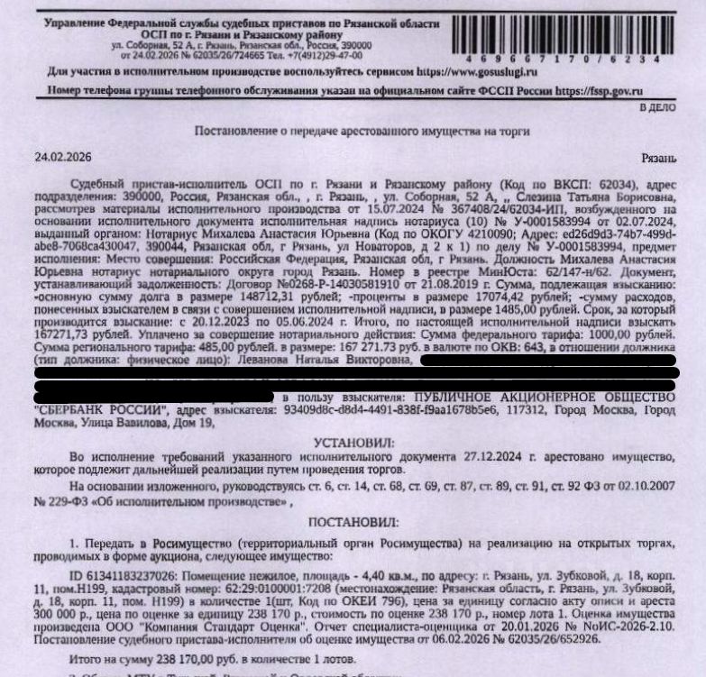 Помещение, назначение: нежилое, наименование: помещение, площадь 4,4 кв.м., подвал, кадастровый номер 62:29:0100001:7208, местоположение: Рязанская область, г. Рязань, ул. Зубковой, д. 18, корп. 11, пом. Н199. Взыскатель: ПАО "Сбербанк России". Начальная цена: 238 170 (Двести тридцать восемь тысяч сто семьдесят) руб. 00 коп., без НДС. Задаток: 110 000 (Сто десять тысяч) руб. 00 коп. Шаг аукциона 1%: 2 381 (Две тысячи триста восемьдесят один) руб. 70 коп.