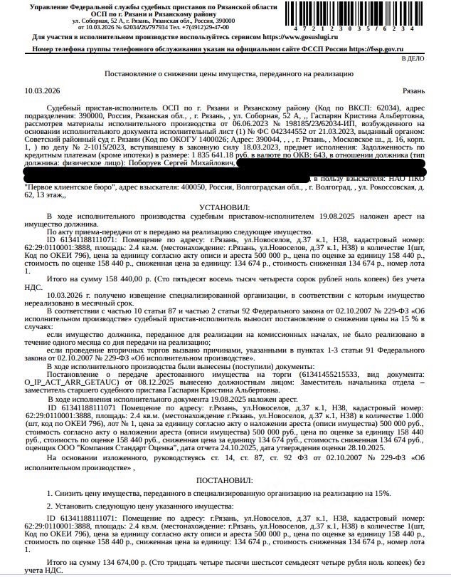 Помещение, назначение: нежилое, наименование: нежилое помещение, площадь 2,4 кв.м, кадастровый номер 62:29:0110001:3888, местоположение: г. Рязань, ул. Новоселов, д. 37 к. 1, Н38. Взыскатель: НАО ПКО "Первое клиентское бюро". Начальная цена: 134 674 (Сто тридцать четыре тысячи шестьсот семьдесят четыре) руб. 00 коп., без НДС. Задаток: 60 000 (Шестьдесят тысяч) руб. 00 коп. Шаг аукциона 1%: 1 346 (Одна тысяча триста сорок шесть) руб. 74 коп.