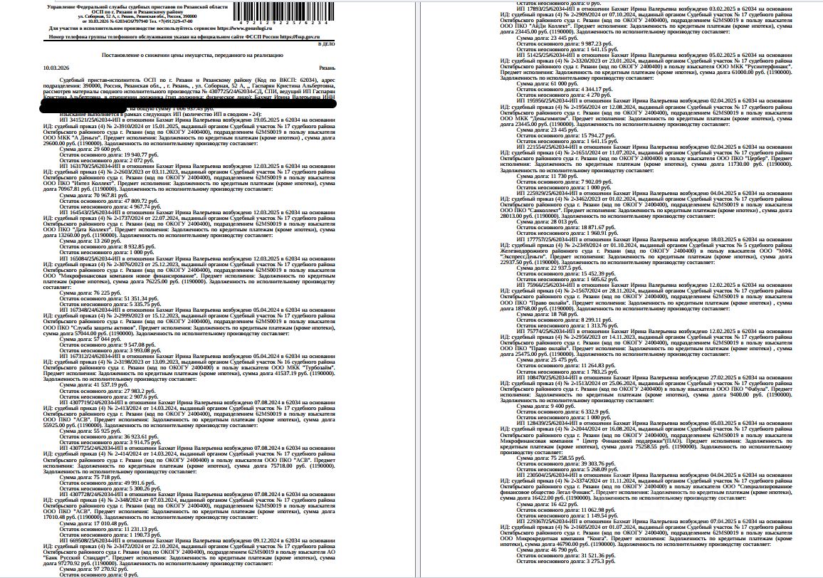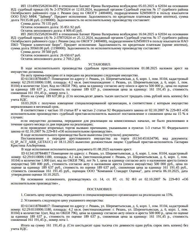 Помещение, назначение: нежилое, наименование: помещение, площадь 4,2 кв.м, кадастровый номер 62:29:0110006:1180, местоположение: Рязанская область, г. Рязань, ул. Шереметьевская, д. 6, корп. 1, пом. Н104. Взыскатель: ООО ПКО "АСВ", ООО ПКО "Дата Коллект" и др. Начальная цена: 161 191 (Сто шестьдесят одна тысяча сто девяносто один) руб. 45 коп., без НДС. Задаток: 70 000 (Семьдесят тысяч) руб. 00 коп. Шаг аукциона 1%: 1 611 (Одна тысяча шестьсот одиннадцать) руб. 91 коп.