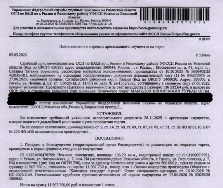 Помещение, назначение: нежилое, площадь 135,2 кв.м., кадастровый номер 62:29:0110005:7961, местоположение: Рязанская область, г. Рязань, ул. Васильевская, д. 7, Н4. Взыскатель: УФНС по Рязанской области. Начальная цена: 11 967 750 (Одиннадцать миллионов девятьсот шестьдесят семь тысяч семьсот пятьдесят) руб. 00 коп., без НДС. Задаток: 5 900 000 (Пять миллионов девятьсот тысяч) руб. 00 коп. Шаг аукциона 1%: 119 677 (Сто девятнадцать тысяч шестьсот семьдесят семь) руб. 50 коп.