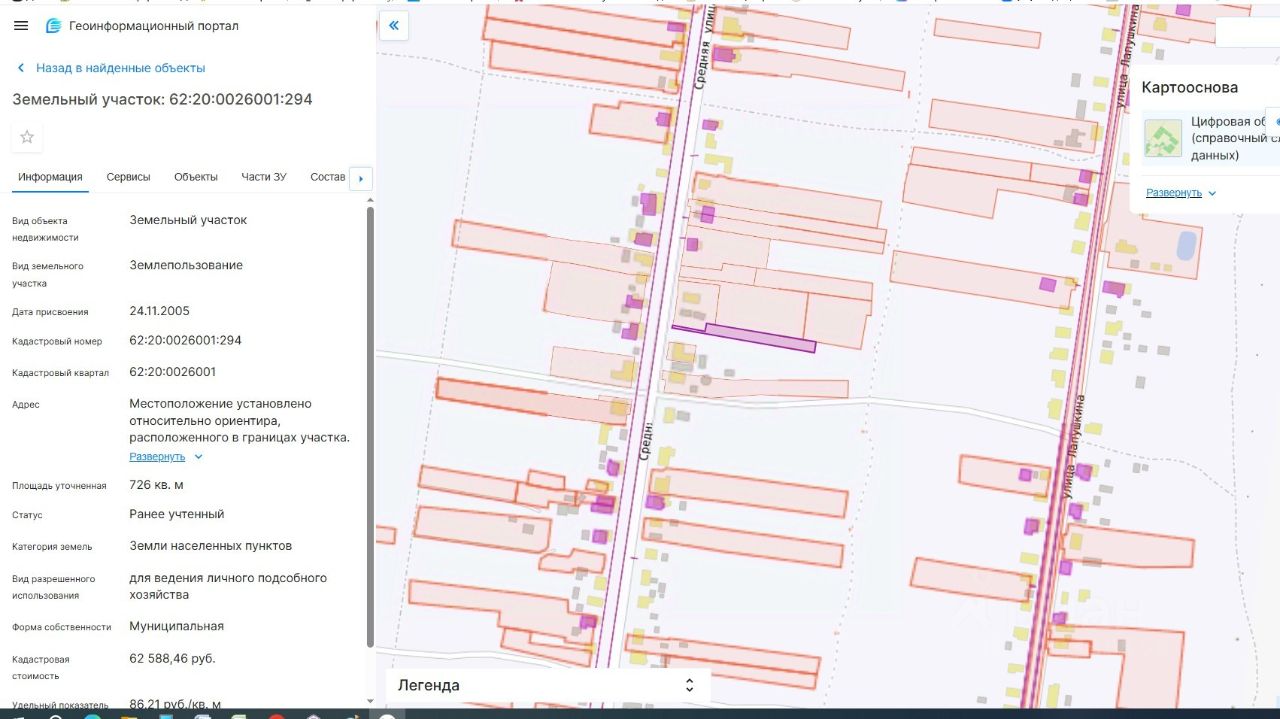 Земельный участок, расположен на землях населенных пунктов, площадью 726 кв.м, с кадастровым номером 62:20:0026001:294, местоположение Рязанская область, Спасский муниципальный округ, с.Ижевское, ул.Средняя, с разрешенным использованием для ведения личного подсобного хозяйства