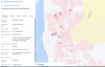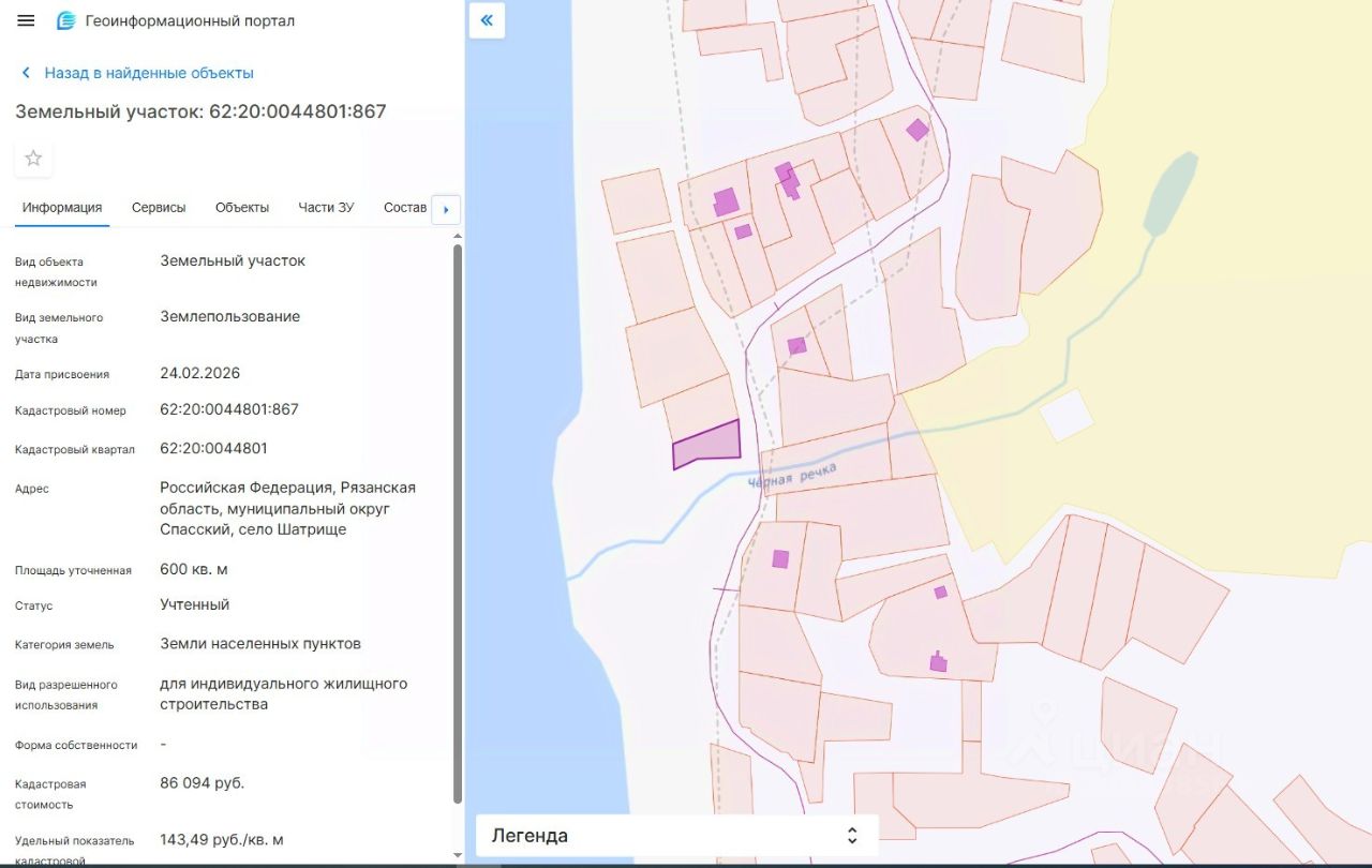 Земельный участок, расположен на землях населенных пунктов, площадью 600 кв.м, с кадастровым номером 62:20:0044801:867, местоположение Рязанская область, Спасский муниципальный округ, с. Шатрище, с разрешенным использованием для индивидуального жилищного строительства