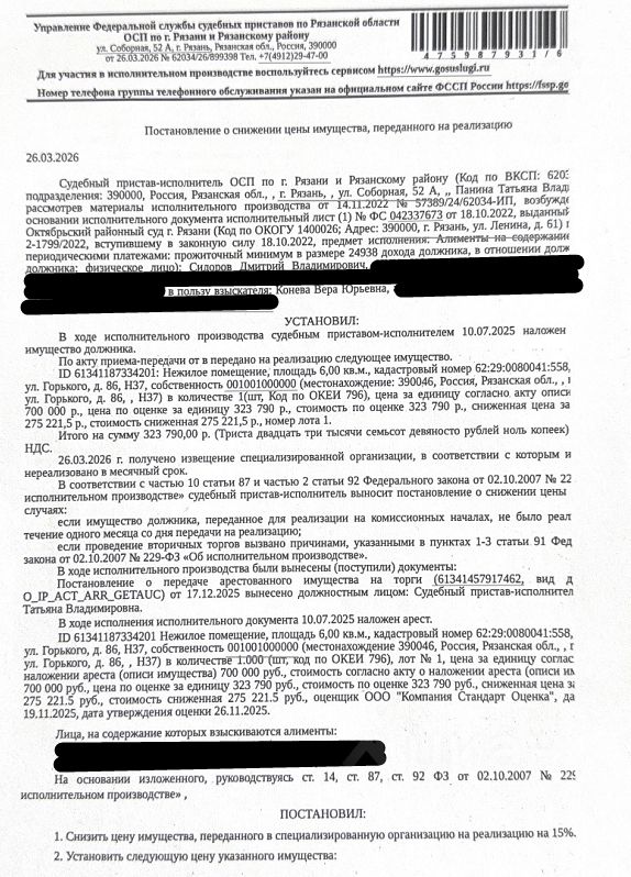 Помещение, назначение: нежилое, наименование: нежилое помещение, площадь 6 кв.м., кадастровый номер 62:29:0080041:558, местоположение: г.Рязань, ул.Горького, д.86, Н37. Взыскатель: Сидорова В.Ю. Начальная цена: 275 221 (Двести семьдесят пять тысяч двести двадцать один) руб. 50 коп., без НДС. Задаток: 130 000 (Сто тридцать тысяч) руб. 00 коп.; Шаг аукциона 1%: 2 752 (Две тысячи семьсот пятьдесят два рубля) руб. 22 коп.