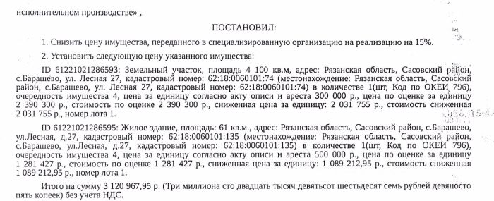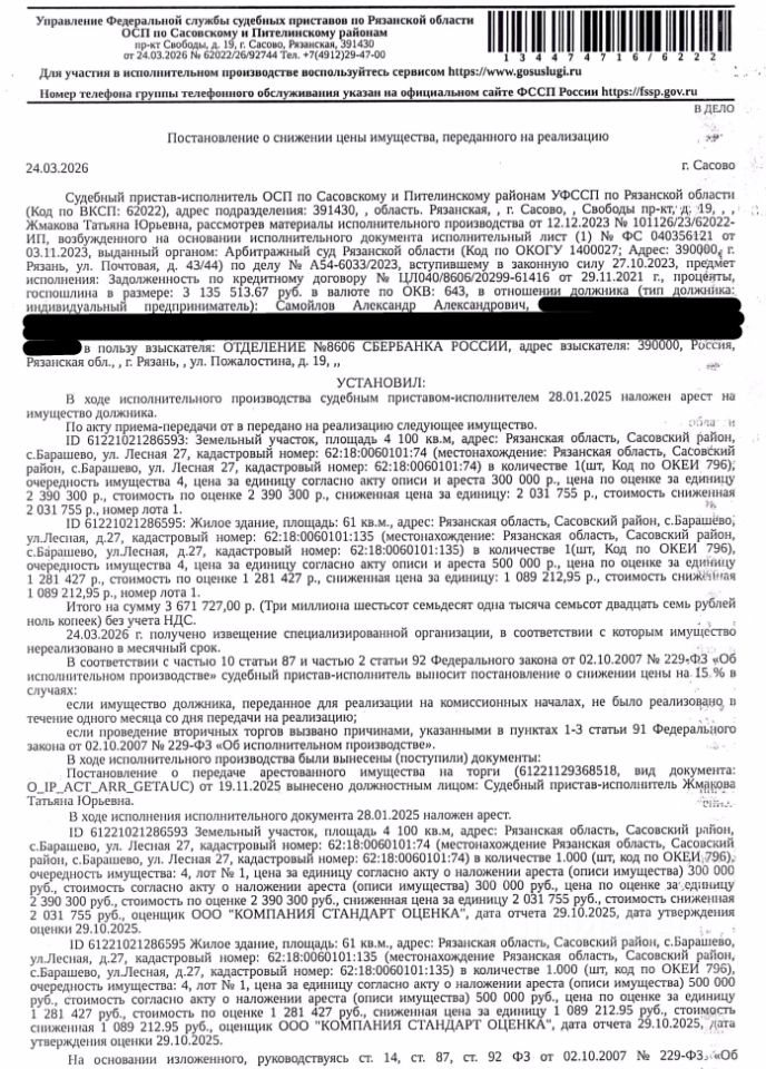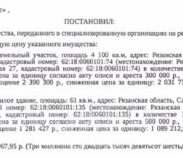 Здание, назначение: жилое, наименование: здание, площадь 61 кв.м., кадастровый номер 62:18:0060101:135, местоположение: Рязанская обл, р-н Сасовский, с Барашево, ул Лесная, д 27. Сведениями о зарегистрированных по данному адресу лицах Организатор торгов не располагает. Земельный участок, категория земель: земли населенных пунктов, виды разрешенного использования: для ведения подсобного хозяйства, площадь 4100 +/- 22.41 кв.м., кадастровый номер 62:18:0060101:74, адрес: Рязанская обл, Сасовский м.р-н, с/п Демушкинское, село Барашево, ул. Лесная, з/у 27. Доп.информация - см.извещение. Взыскатель: ПАО Сбербанк России. Начальная цена: 3 120 967 (Три миллиона сто двадцать тысяч девятьсот шестьдесят семь) руб. 95 коп., без НДС. Задаток: 1 500 000 (Один миллион пятьсот тысяч) руб. 00 коп. Шаг аукциона 1%: 31 209 (Тридцать одна тысяча двести девять) руб. 68 коп