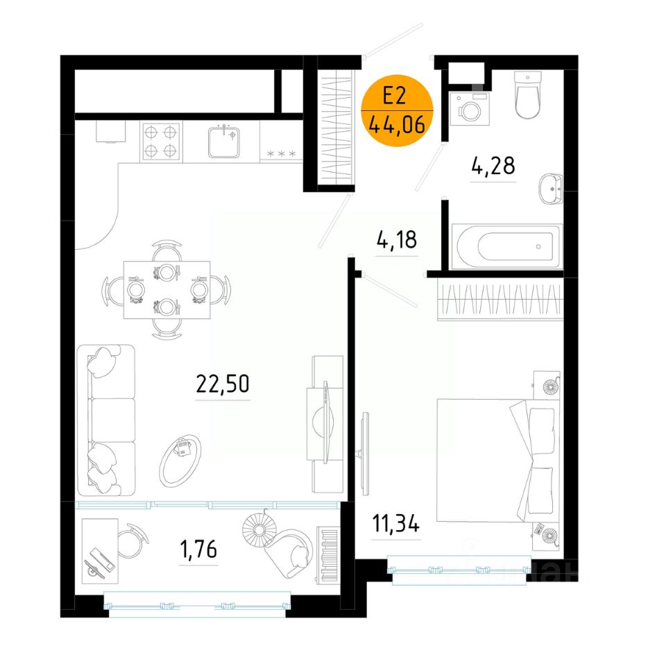Общая площадь44,06 м²