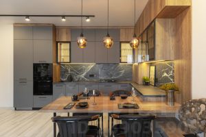 Здесь планировка с кухней-гостиной, отдельной спальней и гардеробной. Потолки выше, чем обычно, окна почти во всю стену — комната наполнена светом и не давит.