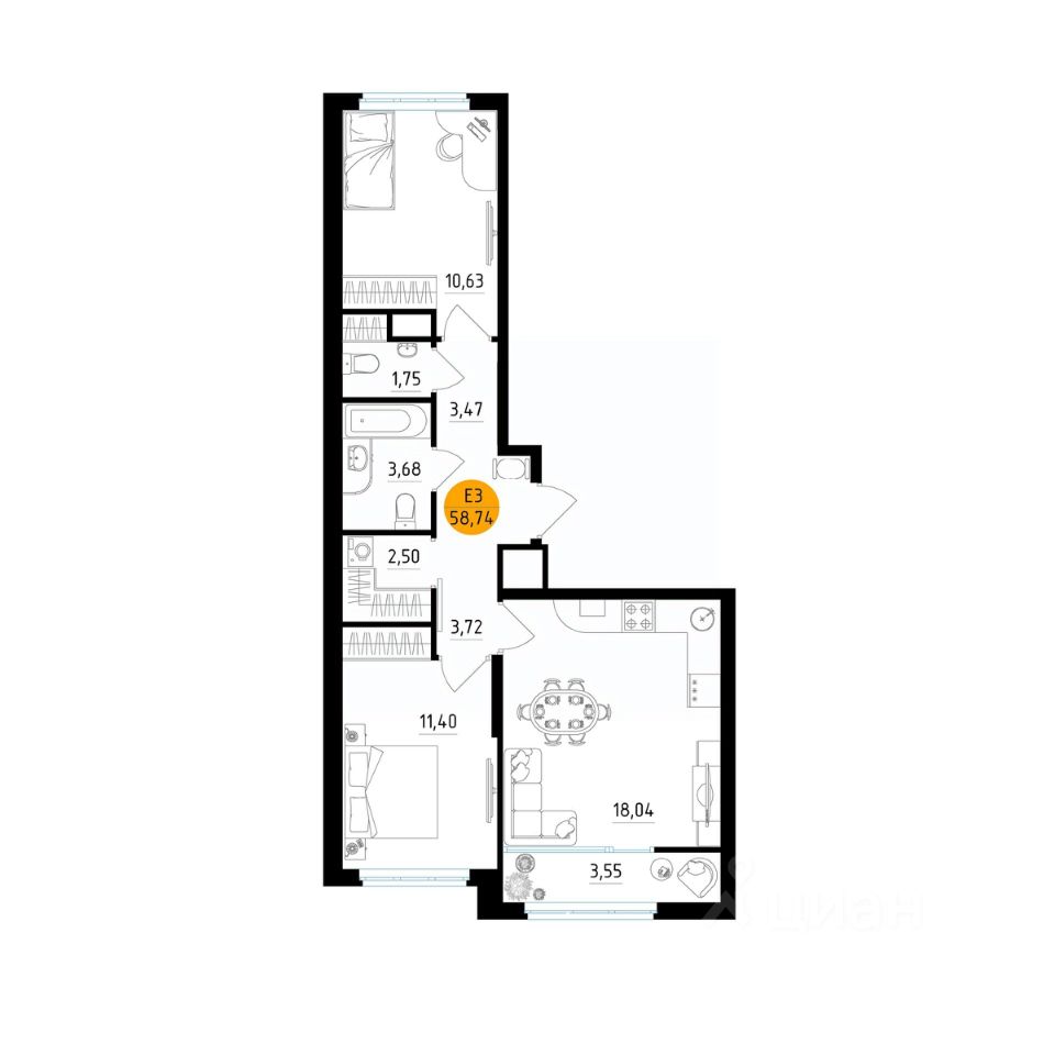 Общая площадь58,74 м²