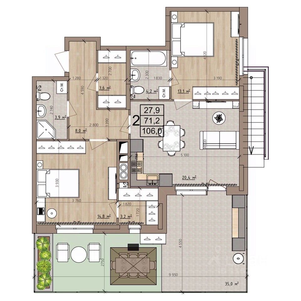 Квартира с собственной террасой! Вы покупаете не только жильё, но и собственный зеленый дворик для барбекю, детского бассейна, качелей, тренажёрного зала, летней оранжереи и так далее - на ваш вкус.