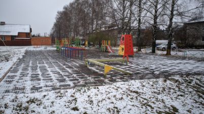 Через дорогу благоустроенная детская площадка и футбольное поле.