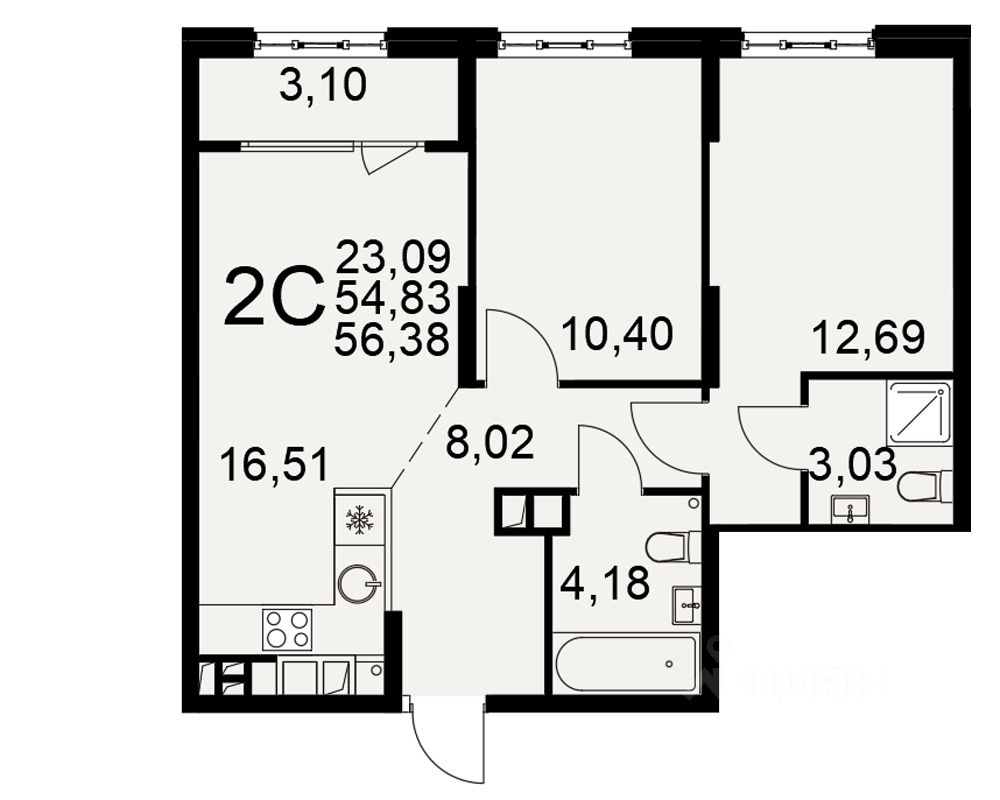 Общая площадь54,83 м²