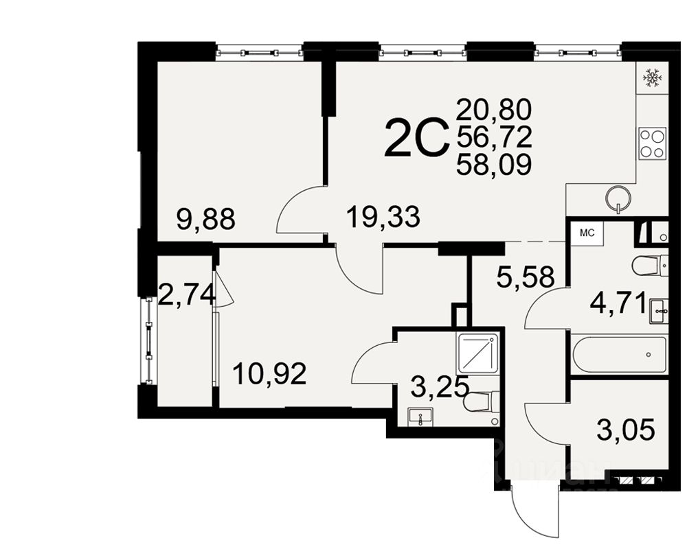 Общая площадь56,72 м²
