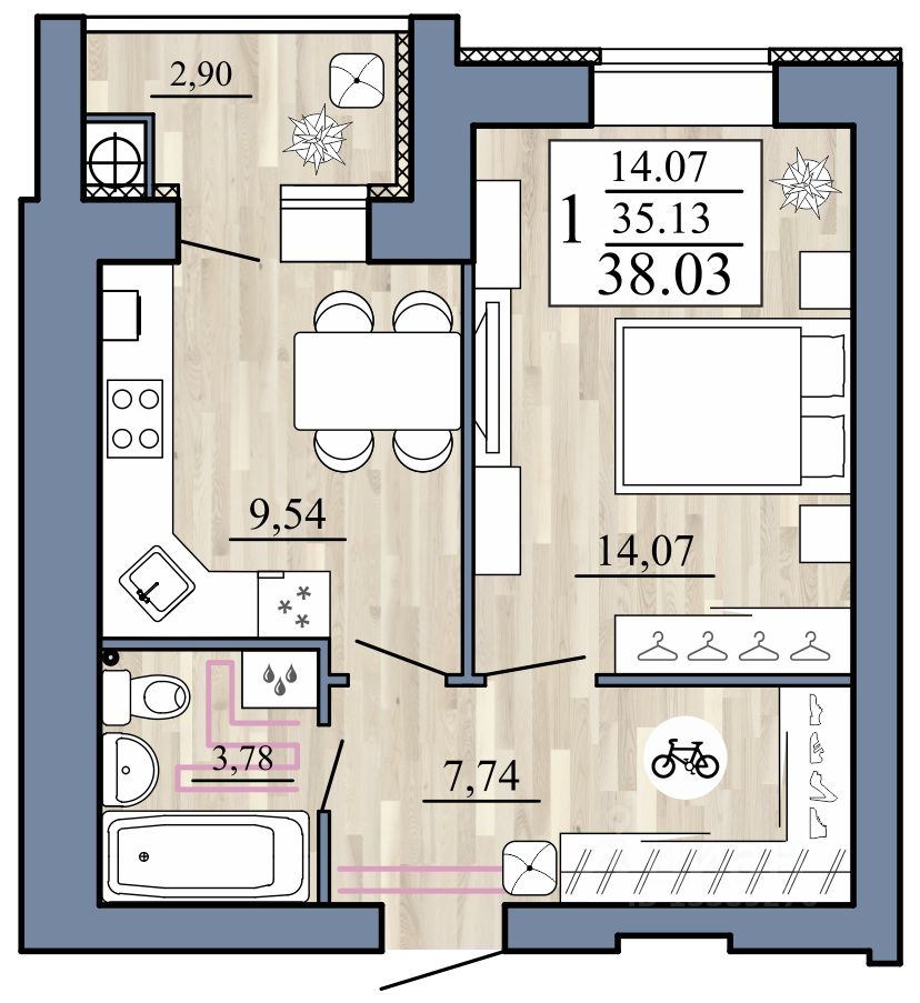 Уютная однокомнатная квартира площадью 38,03 кв.м с классической планировкой, идеально подходящей для комфортного проживания.