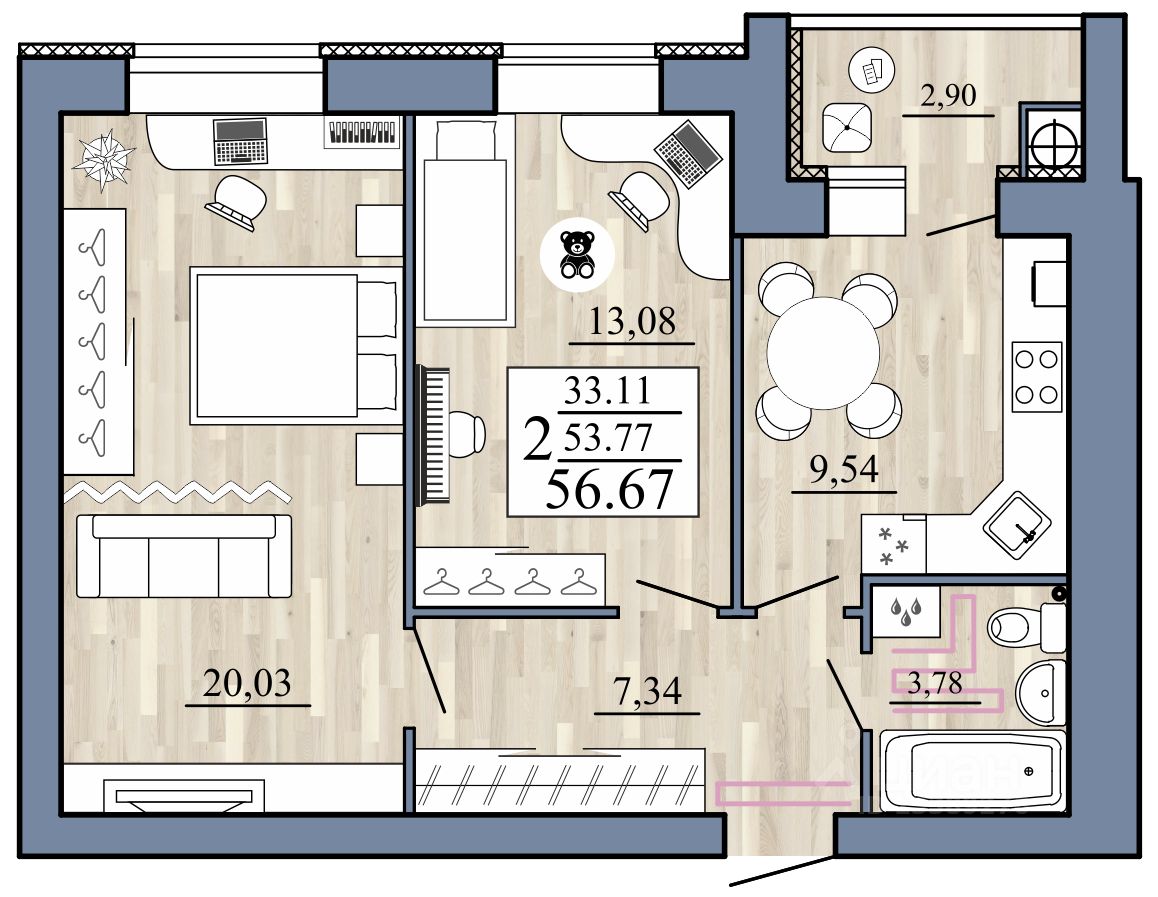 Уютная двухкомнатная квартира площадью 56,67 кв.м с классической планировкой, которая создаёт атмосферу комфорта и уюта.