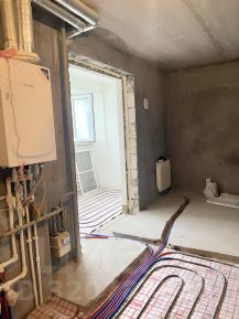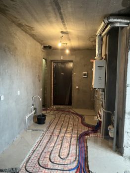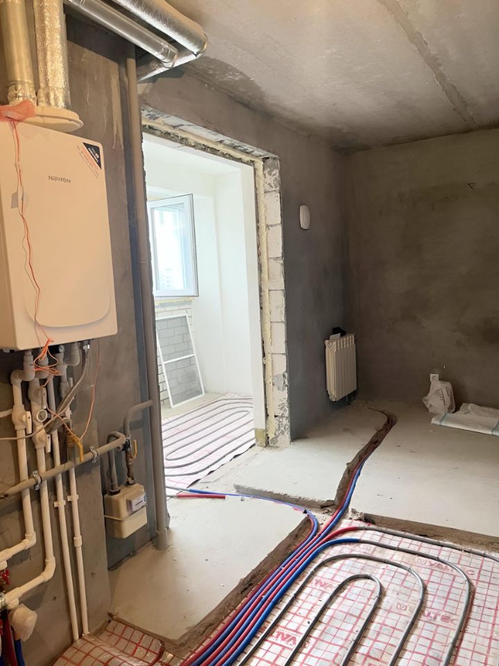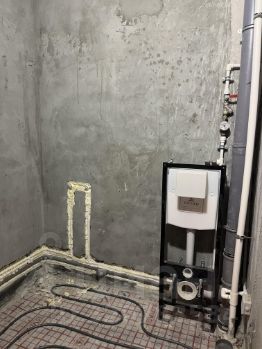 полностью переделана сантехническая разводка, с установкой инсталляции (унитаз есть не установлен), счетчиков, гребенки ,необходимых подводок и всего сопутствующего;