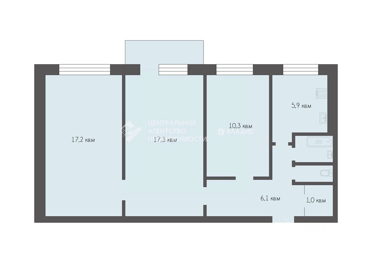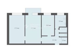 Комнаты смежно-изолированные (10,3 + 17,3 + 17,2 кв. м), что позволяет удобно зонировать пространство.