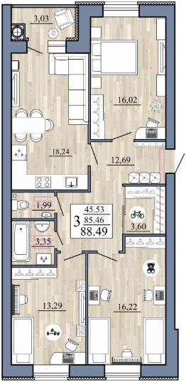 Главное сокровище — кухня-гостиная 18.24 кв. м, где легко разместится обеденная зона для дружных ужинов. Три комфортабельные комнаты (16.02, 16.22 и 13.29 кв. м) подарят личное пространство каждому.