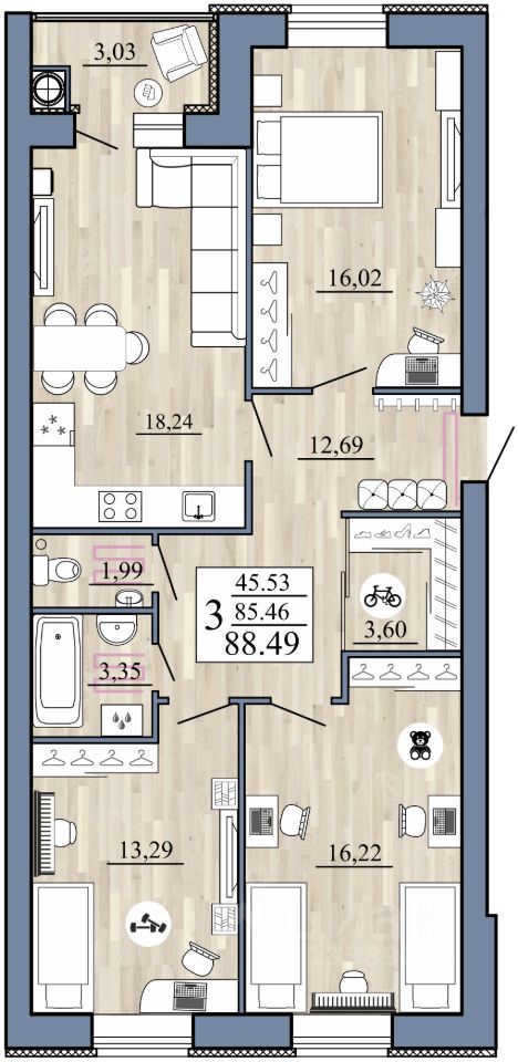 Главное сокровище — кухня-гостиная 18.24 кв. м, где легко разместится обеденная зона для дружных ужинов. Три комфортабельные комнаты (16.02, 16.22 и 13.29 кв. м) подарят личное пространство каждому.
