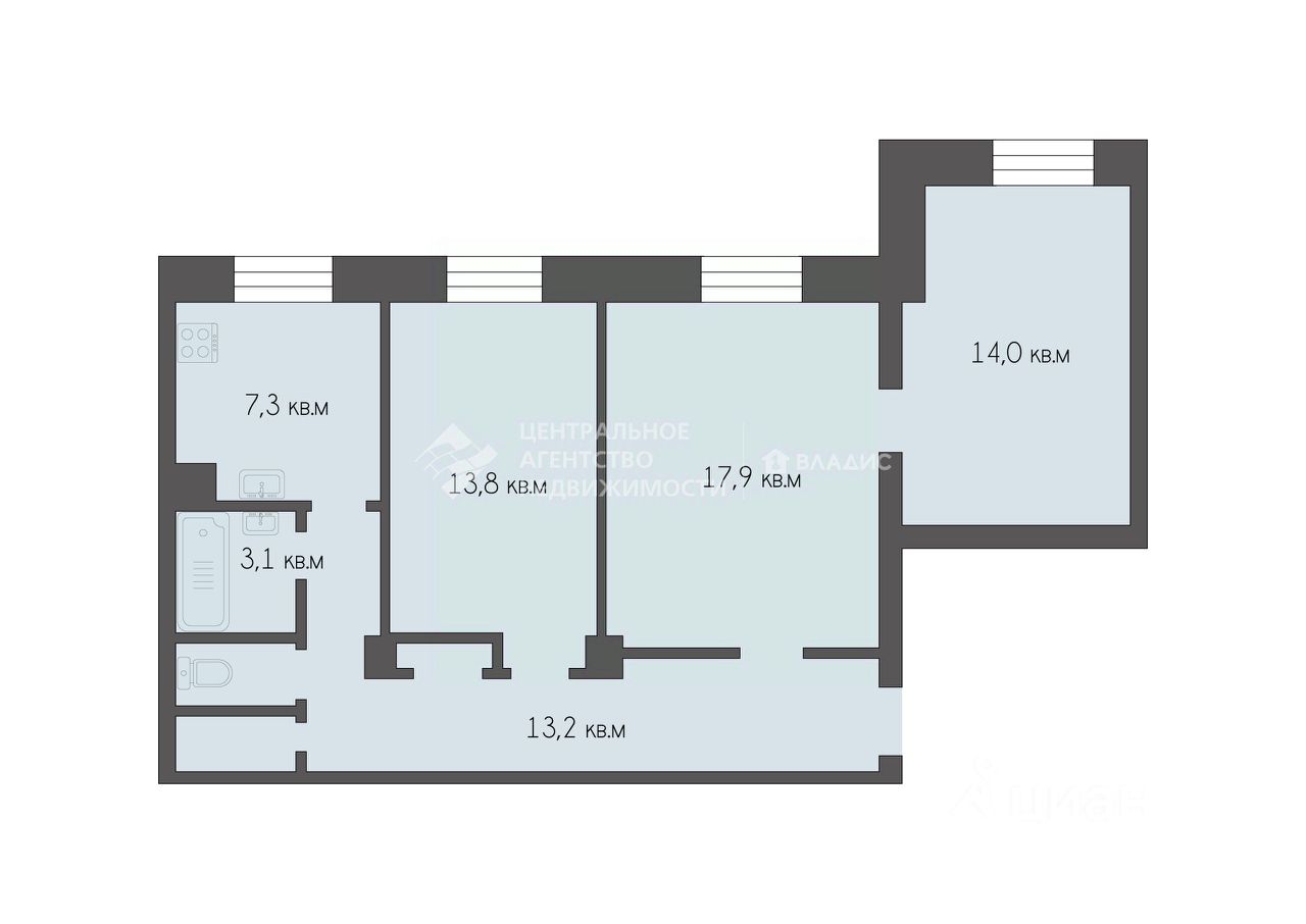 Квартира расположена на первом этаже пятиэтажного кирпичного дома 1957 года постройки. Высота потолков — 3 метра, что создаёт ощущение простора и свободы. Жилая площадь составляет 45,7 кв. м, а площадь кухни — 7,3 кв. м. Три комнаты имеют площадь 13,8 кв. м, 14,0 кв. м и 17,9 кв. м, что позволяет каждому члену семьи иметь своё пространство.