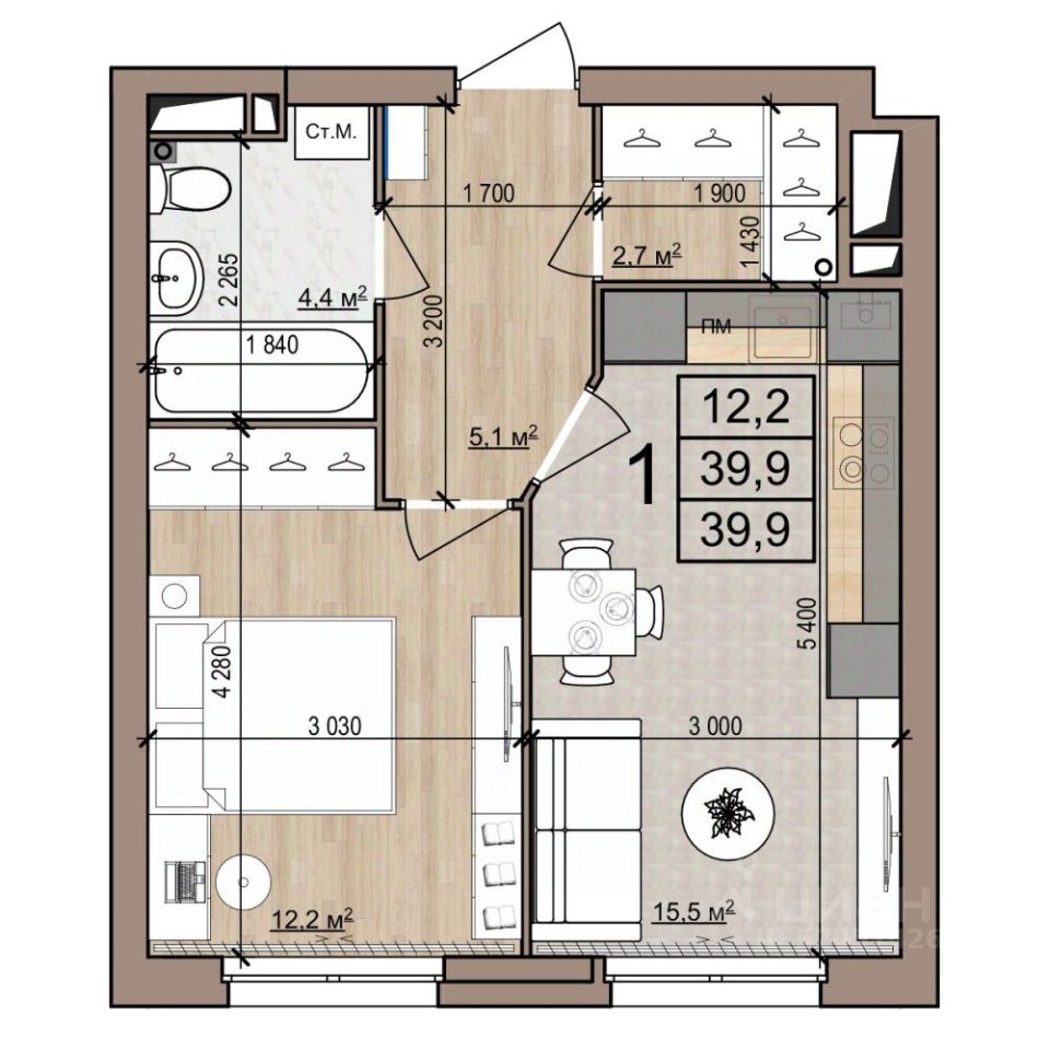 1-комн. квартира, 39,9 м²