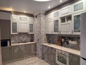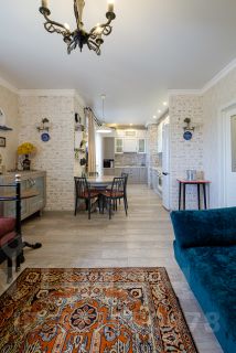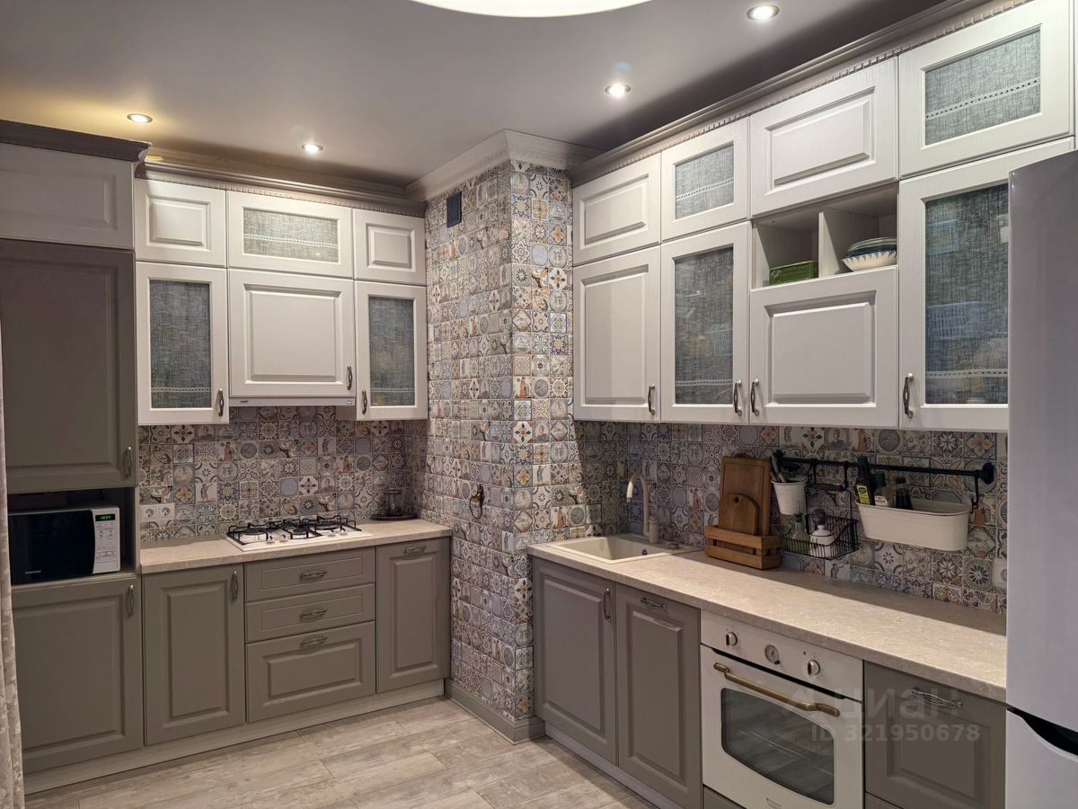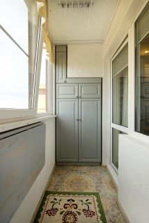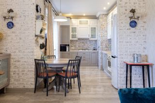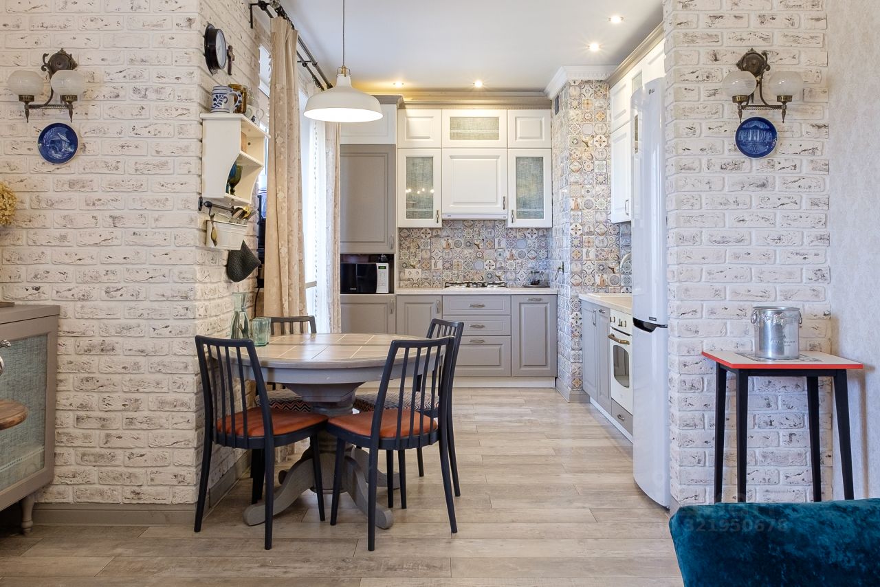 Удобная планировка с большой кухней-гостиной с выходом на лоджию площадью 3,6 м2, где есть встроенный шкаф для хранения, выполненный в одной цветовой гамме с кухней. Кухонный гарнитур изготовлен компанией Мария в серо-белых цветах. Отделка: кирпичная плитка, керамическая плитка и обои в винтажном стиле. Из окна открывается красивый вид на Окские луга.