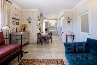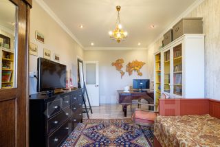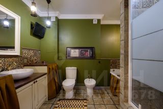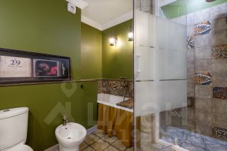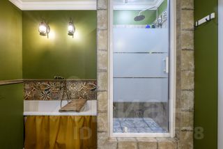 Большая совмещенная ванная комната площадью 8 м2. Стильная мебель, потолочные и настенные светильники остаются в квартире. В ванной комнате встроенная душевая кабина из плитки с тропическим душем, ванна, а также биде и большая система хранения. Есть место и подводка для подключения стиральной и сушильной машины. Часть стен выкрашена качественной водонепроницаемой краской, номер колера сохранен. Во всех мокрых зонах керамическая плитка.