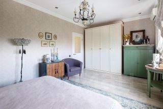 Мастер-спальня площадью 20 м2 выполнена в спокойной серой цветовой гамме. Обои от английского производителя Osborne & Little. Комната имеет правильную планировку. Из кабинета можно сделать детскую или гостевую спальню.