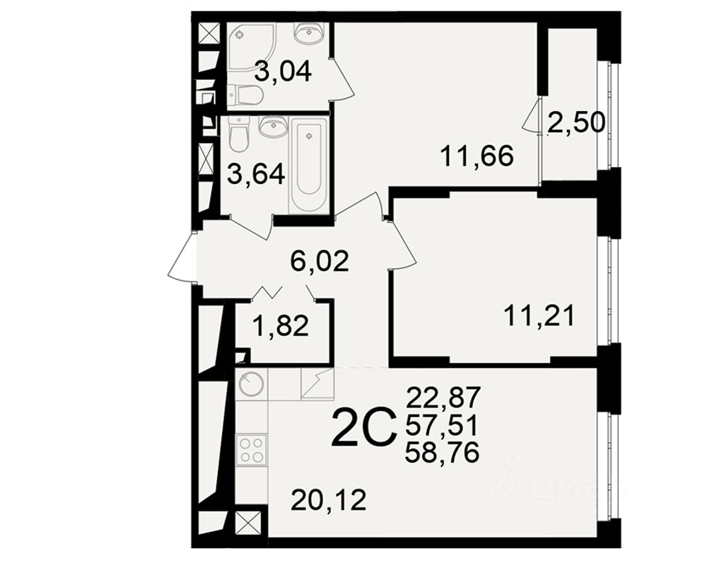 Общая площадь57,51 м²