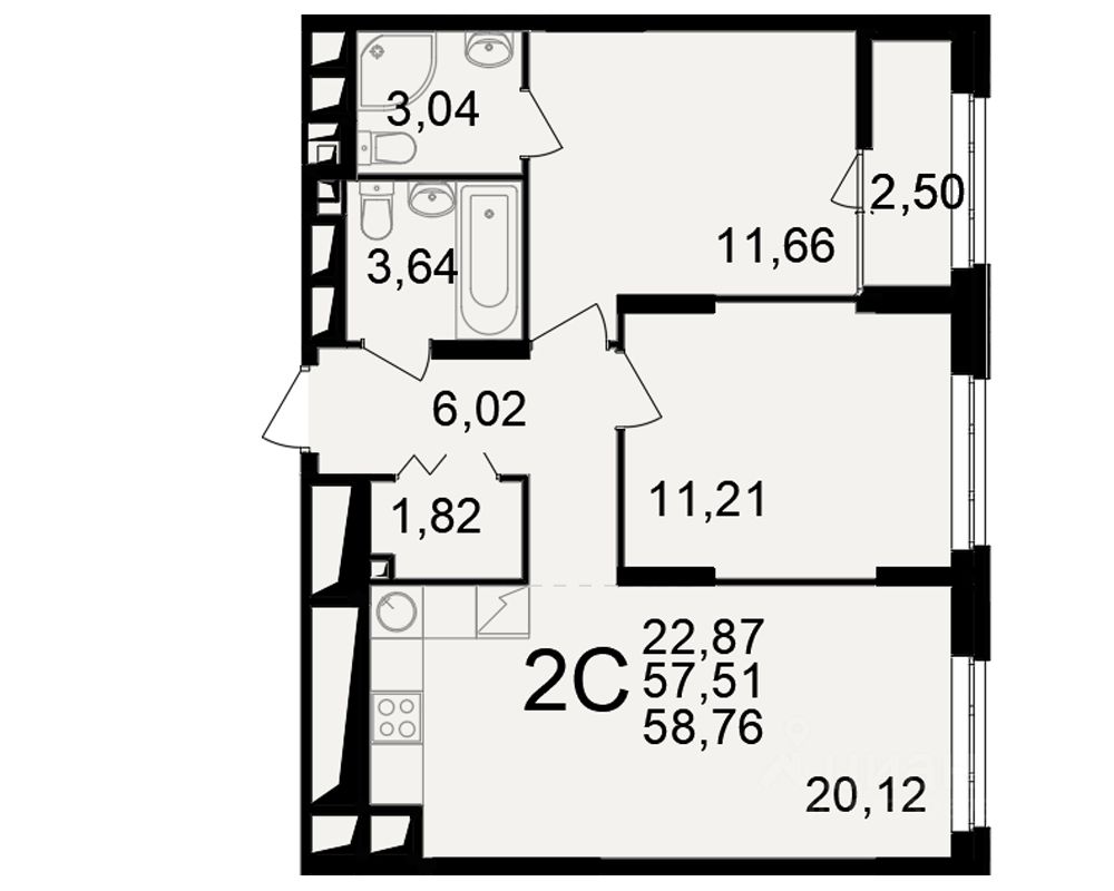 Общая площадь57,51 м²