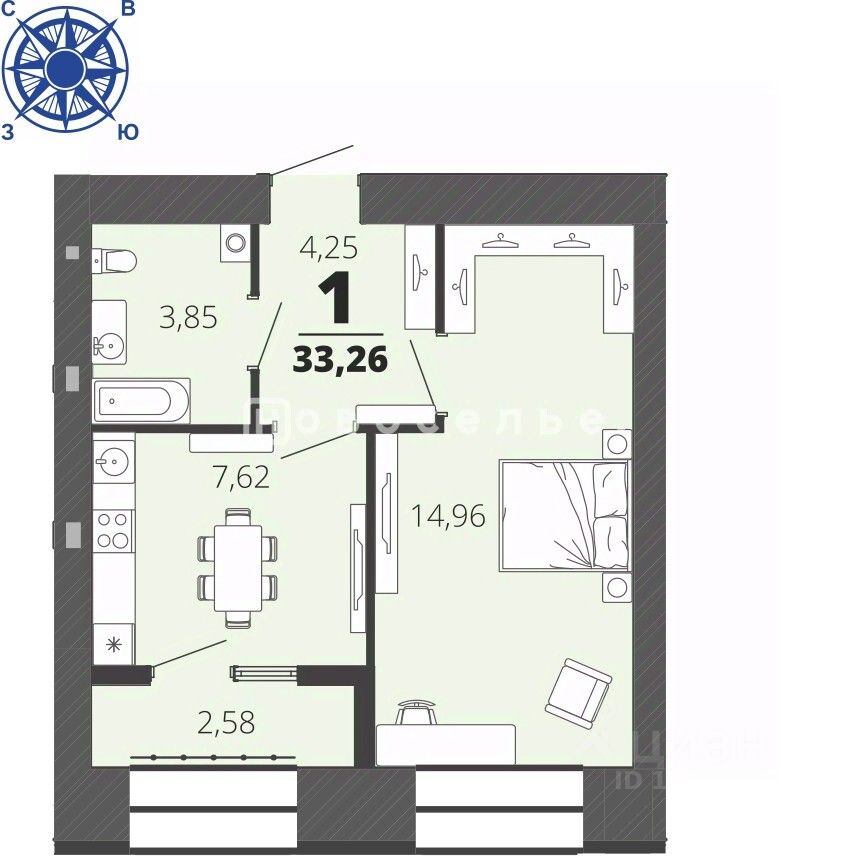 Общая площадь квартиры с учётом лоджии - 33,26 кв.м.