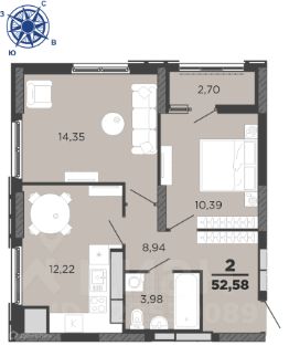 2 комн. квартира в ЖК "Академик", площадь 52.58 м², жилая м², кухня 12.22 м²