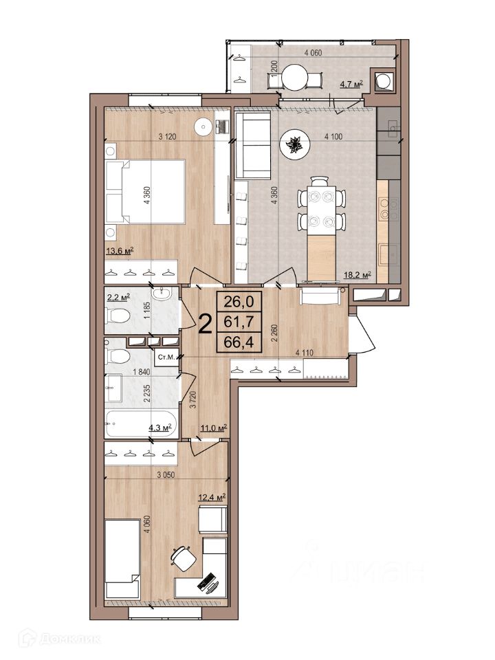 2 комн. квартира в ЖК Skyline (Скайлайн), площадь 66.4 м², жилая 26 м², кухня 18.2 м²