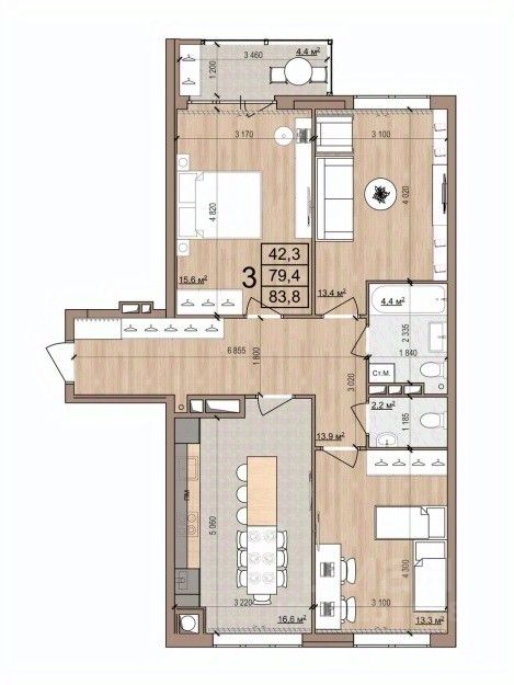 3 комн. квартира в ЖК Skyline (Скайлайн), площадь 83.8 м², жилая 42.3 м², кухня 16.6 м²