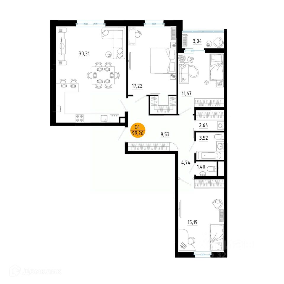 3 комн. квартира в ЖК Смарт Квартал ЦЕНТРАЛЬНЫЙ, площадь 99.26 м², жилая 44.08 м², кухня 30.31 м²